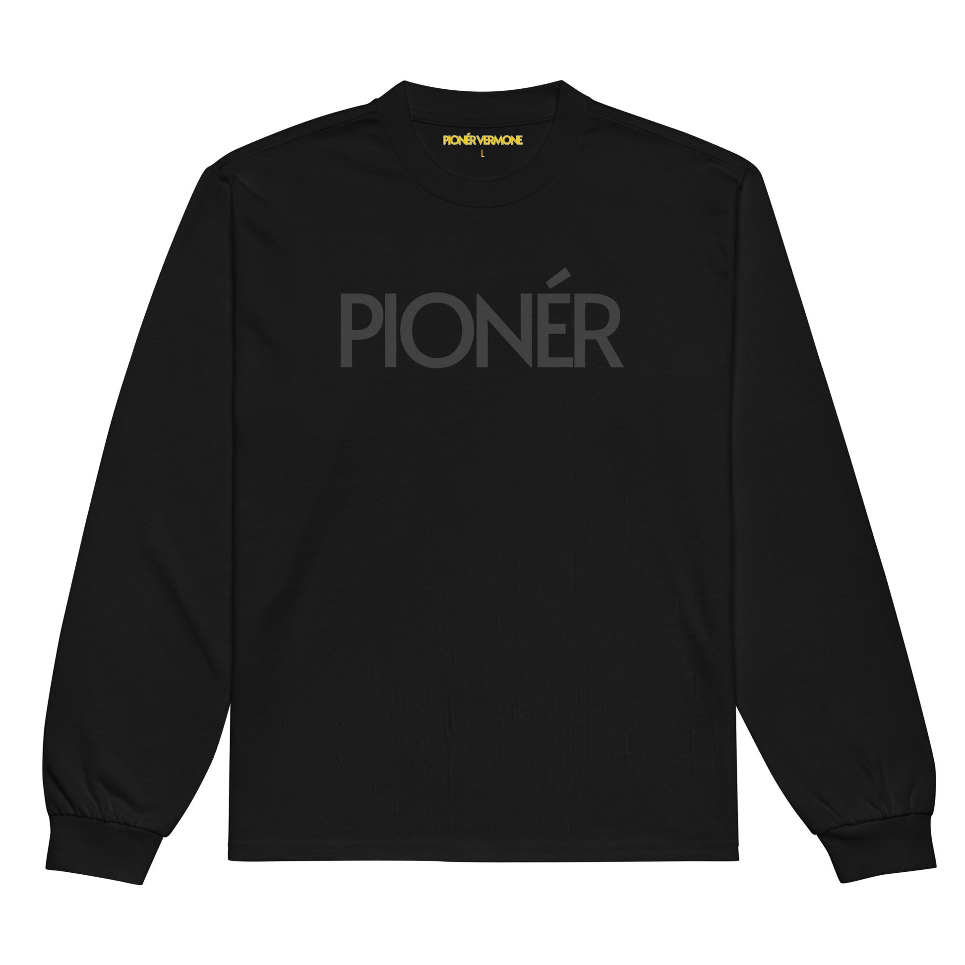 The Pionér logo appears in bold, matte-like finish on the signature long sleeve tee.