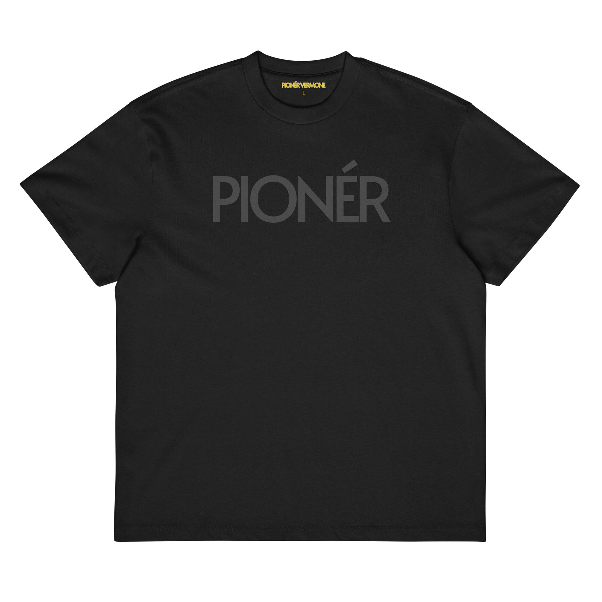 The Pionér core logo appears in bold, matte-like finish on the signature tee.